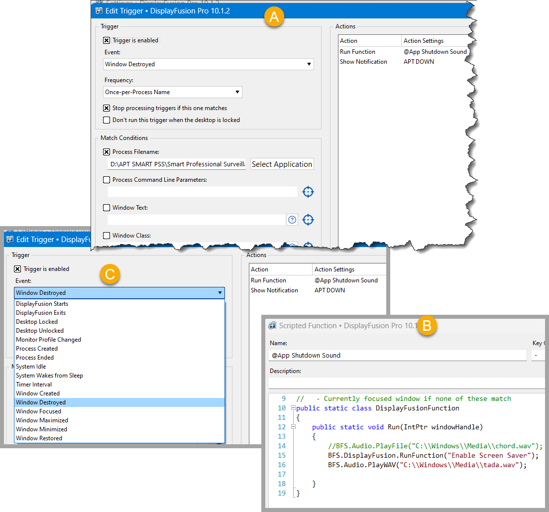 To accomplish this, I created a Window Destroyed trigger (A) which calls a sub-function (B). It does fire when the program is closed, but it seems to also fire when the program is started. I verified my suspicion by adding a 'Show Notification' action.