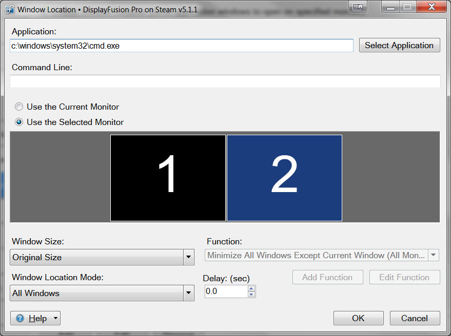 I'm using Windows 7 Pro x64 and DisplayFusion v5.1.1. Calls to .BAT, .CMD, etc. or their shortcuts insist on using monitor 1, even if I set the Window Location and use a delay. However, using the SHIFT+WIN+X key combination does move the CMD window to monitor 2.