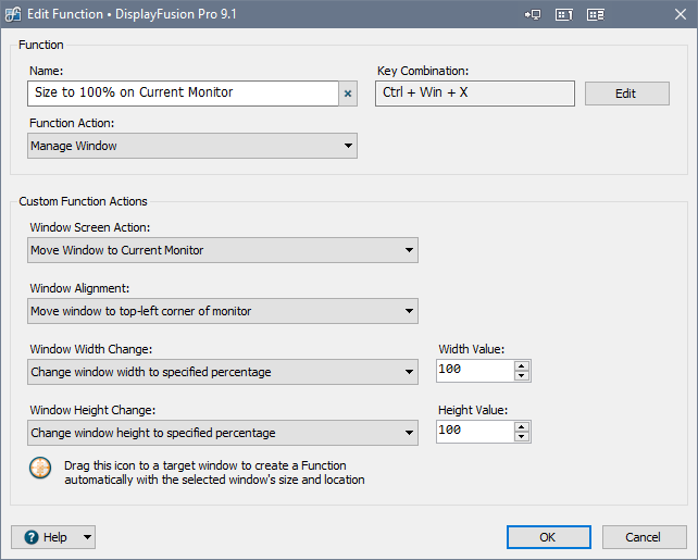 Displayfusion 7.1 would put the window to the maximized state, so it's working as intended.