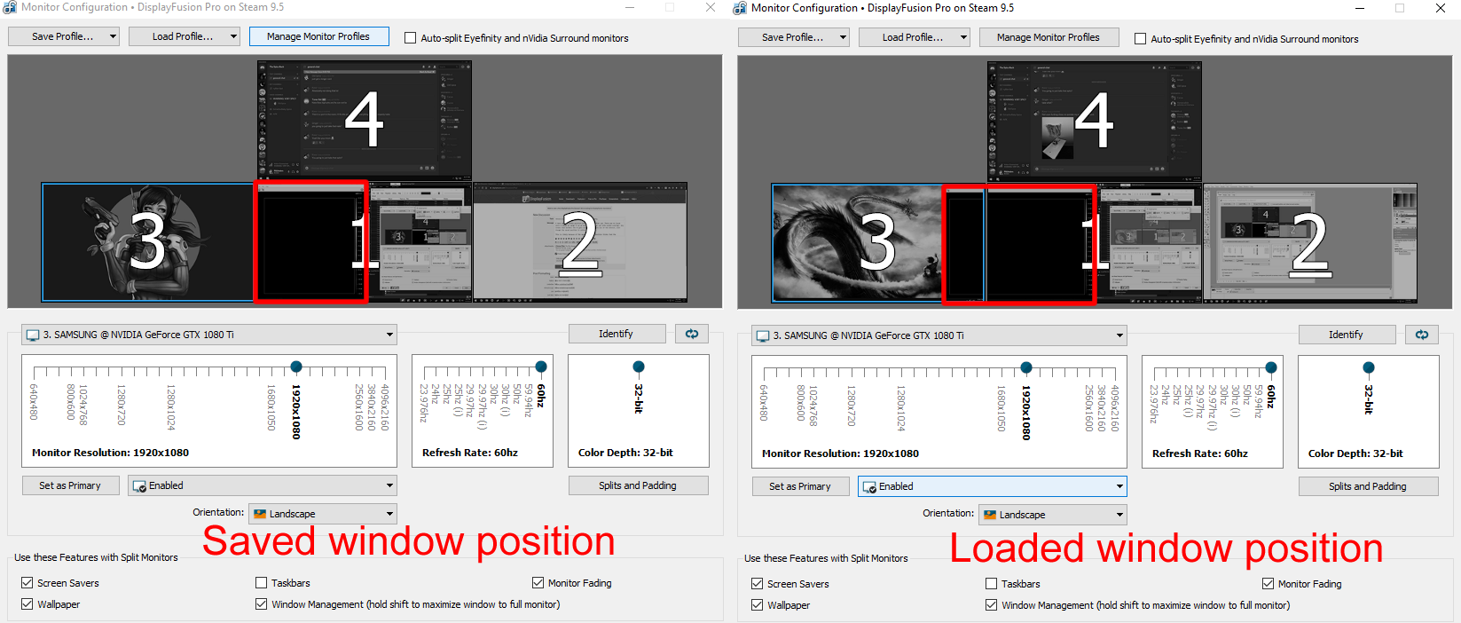 I have saved a window position profile that I often use. There was no issue until I added my large TV as an alternate monitor (at 125% window scaling). Any window that borders the TV gets scaled up and cuts out of the monitor, even though the saved position is within the monitor. This does not happen when the TV is reduced to 100% scale.