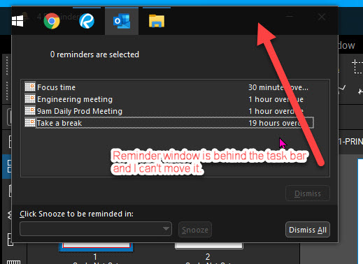 I have an issue with window sliding up under a task bar at the top of my screen and you can't click on the title bar to move the window. Now most of the time I can use keyboard short cuts to move the window but sometimes I can't like with an Outlook reminder window. Is there any way to set the priority of selection so that you can select the title bar of a window over the taskbar?