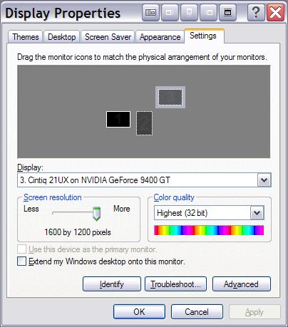 I just noticed that after I enabled my two monitors using beta 14, Windows XP's SP3 Display properties Settings tab is not updated with the new info. DF did successfully activate the monitors. See the two images below.