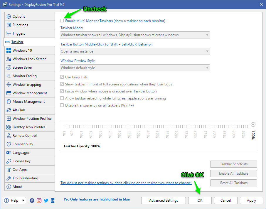 * Disable "Enable Multi-Monitor Taskbars (show a taskbar on each monitor)