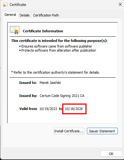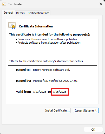 My work now requires a "valid certificate" in order to install an application. As you can see in the attached images, the DF Cert is only valid until 7/26/2025.