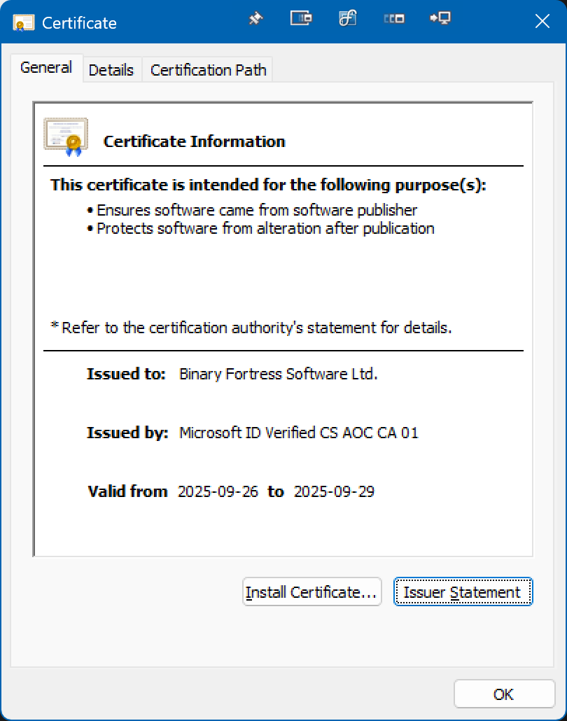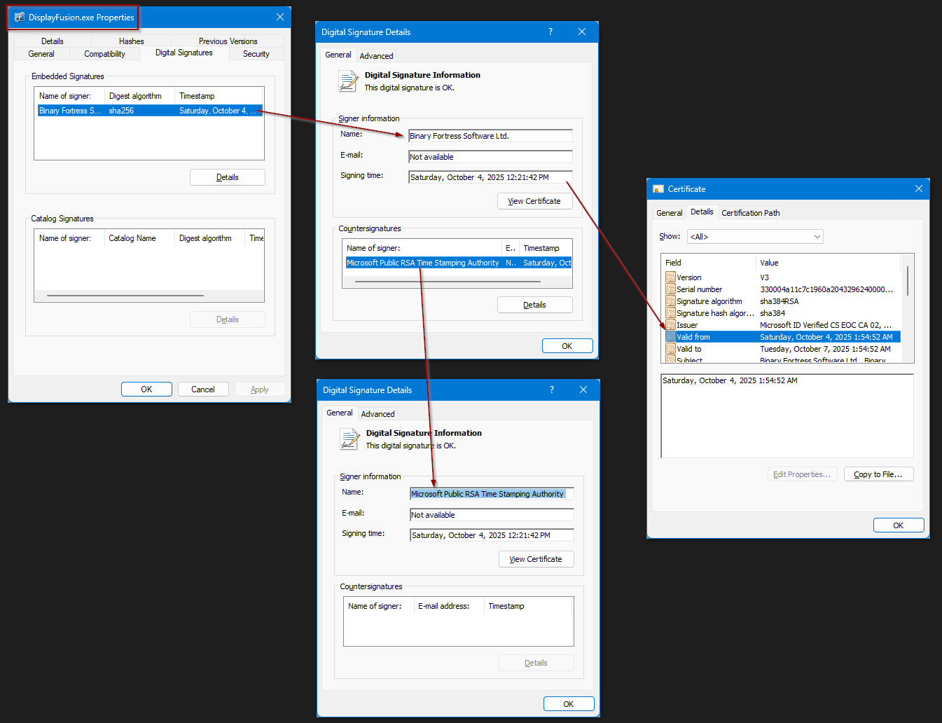 In the Countersignatures section of DisplayFusion's Digital Signature Details, you can see Microsoft Public RSA Time Stamping Authority. This authority run by Microsoft is trusted by Windows and signifies that DisplayFusion was signed at a specific time. If that specific time is within the validity period of the identity certificate, then everything should be fine.