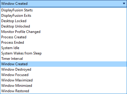 | Run Function | Runs a pre-defined DisplayFusion function. | Available for all Events | Function select from dropdown (Required) |